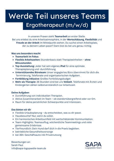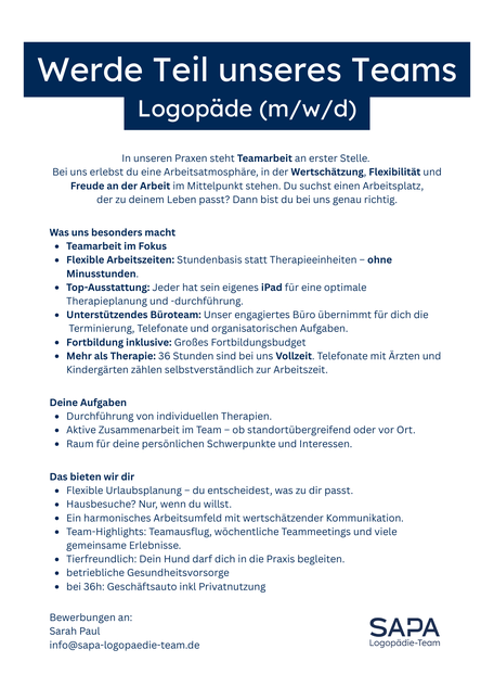 Schicke deine Bewerbung an Sarah Paul unter info@sapa-logopaedie-team.de oder nutze unsere Schnell-Bewerbung.